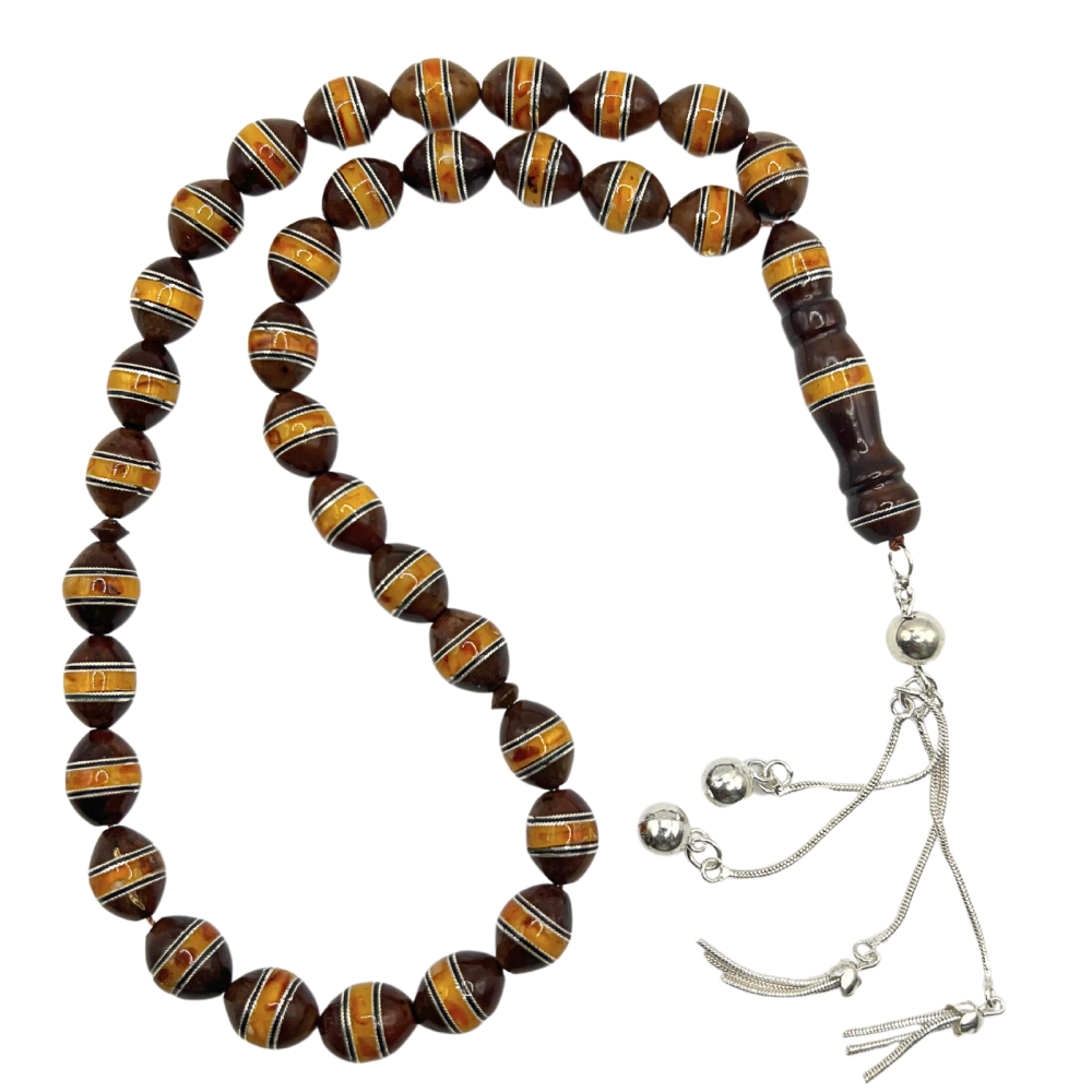 سبحة من خشب الكوكمكونة: 33 حبةاللون: بني اسودمزينة بفضة وحجر كهرمان طبيعيتعتبر المسبحة المصنوعة من خشب الكوك جميلة ومصنوعة يدويًا.مصنوعة من مواد عالية...
