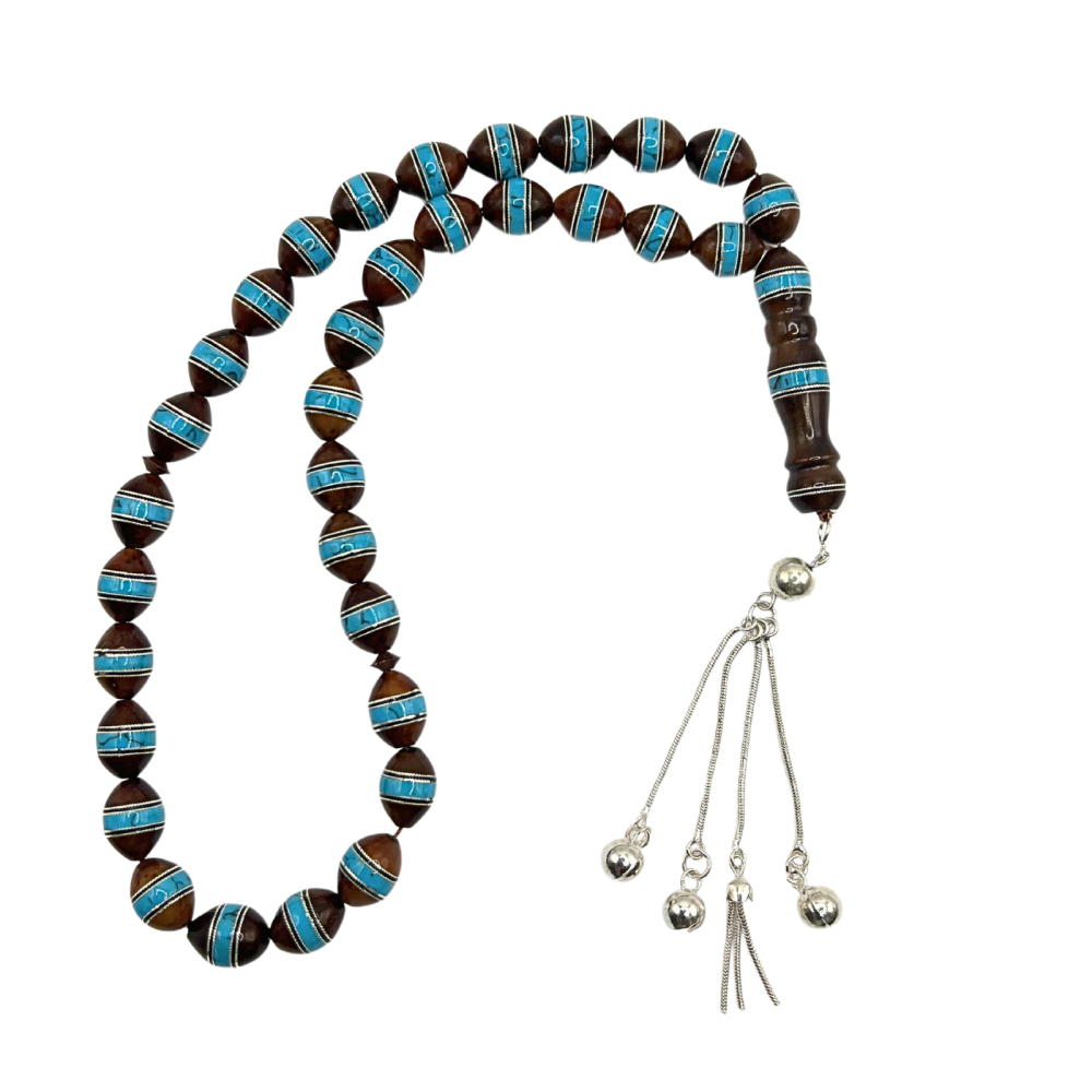 سبحة من خشب الكوكمكونة: 33 حبةاللون: ازرقمزينة بفضة و حجر الفيروزتعتبر المسبحة المصنوعة من خشب الكوك جميلة ومصنوعة يدويًا.مصنوعة من مواد عالية الجودة....