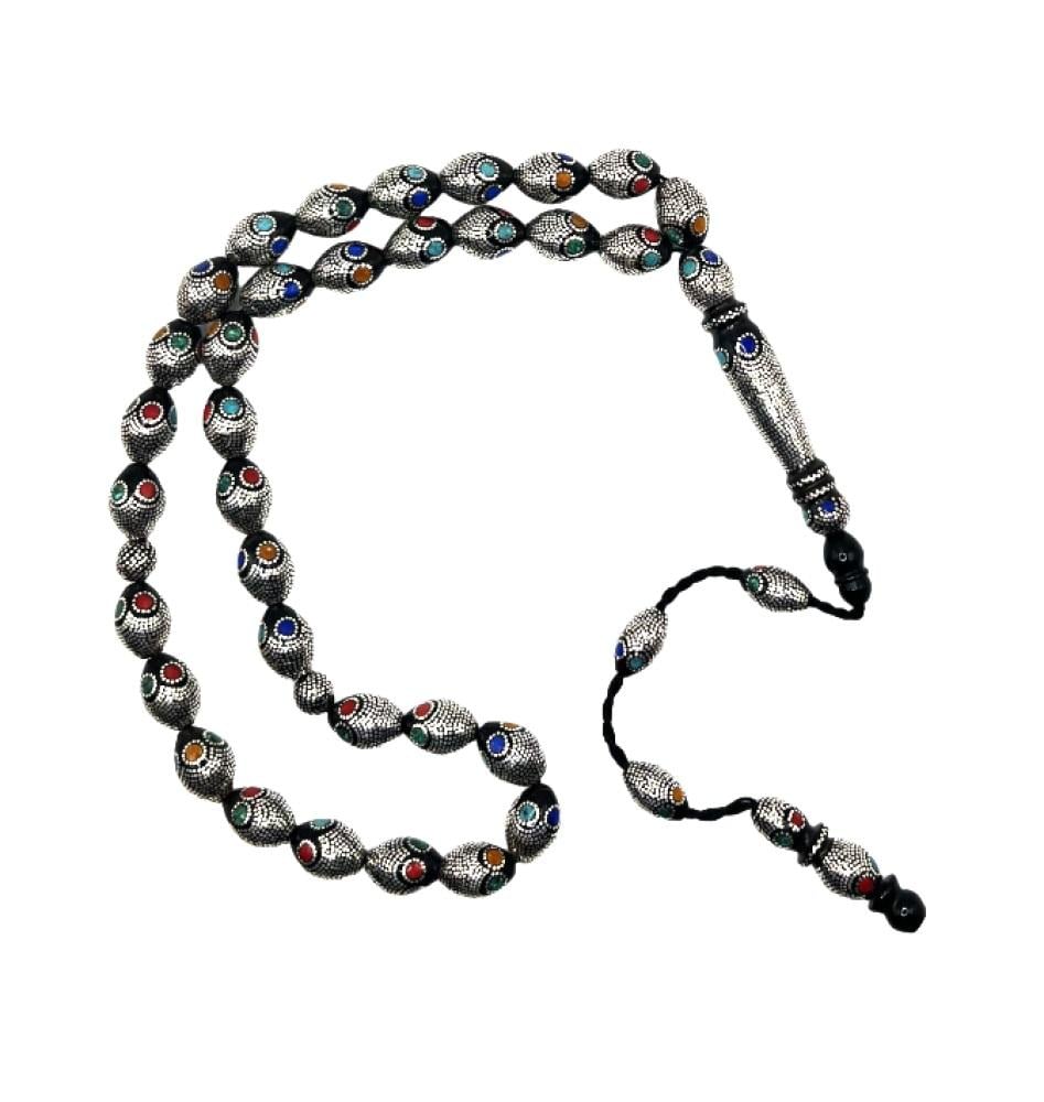 مميزات سبحة حجر يسر بتخريم فضة مع أحجار فيروز، كهرمان، مرجان، وملاكيت: